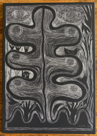 Leaf Spirit, 5″ x 7″, Scratchboard Drawing on Panel, 2021, by Lily S. May