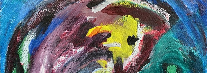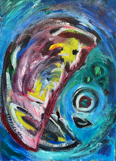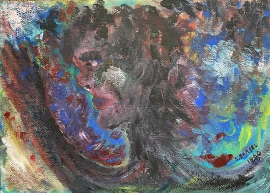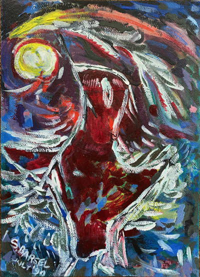 Recently I came upon three acrylic paintings that I barely recall doing. The first one, in particular, reminds me of a larger work I did that I posted on August 15th. All three of these rediscovered paintings feel related in their spontaneous style and in their depiction of some kind of pain. They were done a year before the larger Moon/Skull Portrait and are all a little darker than they appear here.