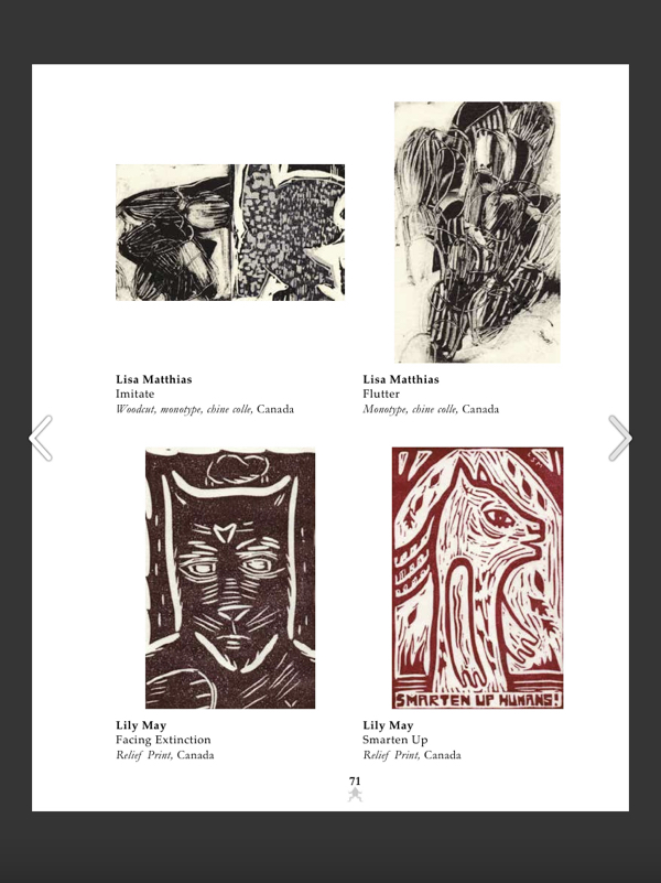 Normally BIMPE would have travelled to three venues in western Canada later in the year. I imagine it was very disturbing for the creator and organizer, Peter Braune, to realize that would not be happening and to arrange to store prints from around the world for over two years. I’ve read in the catalogue that he has also been ill. Knowing that, I feel that his dedication to the exhibition is further revealed. He, with the help of jurors, volunteers and others was able to finally put on the show this November at a Vancouver gallery. Now it is also a virtual show that’s on until March 1/23.