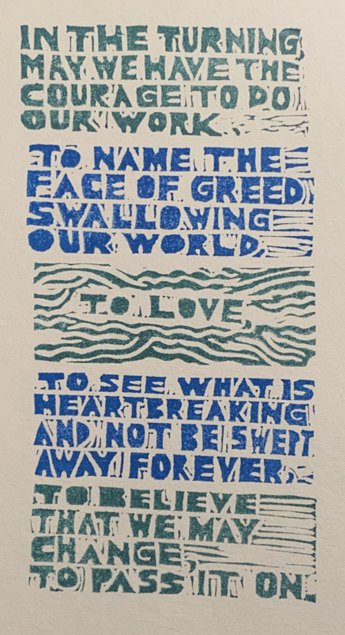 And the poem is one I wrote in 1993 that still has meaning for me. And while I am not someone who is filled with hope, the poem is, for me, an antidote to despair. I carved five stamps with the words of the poem sometime within the last ten years.