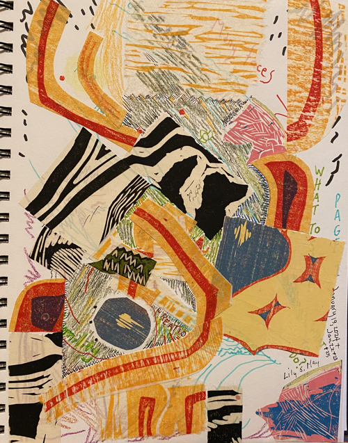 The collage is from a series I’ve begun in which I’m reusing old artwork, creating something further with the linocuts and woodcuts I made, some over 50 years old. Prints are a great medium for collages because they are multiples of roughly the same image in each edition or group. So I can cut up one of the prints in the edition and keep one for myself. As I work, it dawns on me that these fragments are not just pieces of my life, but also have meaning for me because of the people and buildings being smashed apart in Gaza.