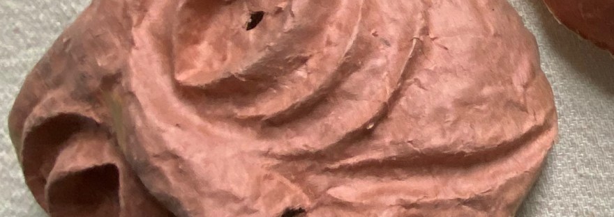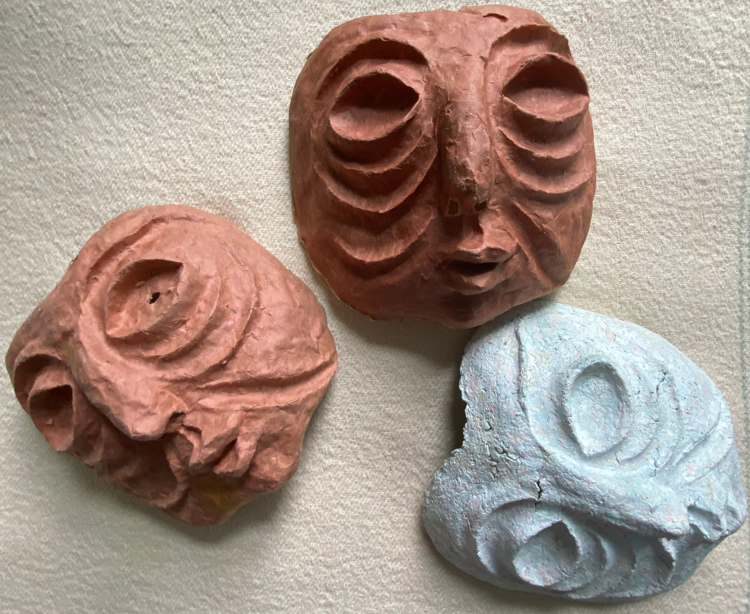 While sorting through some of my past work, I came upon a mask I made maybe 20 or 30 years ago. I made a mould, then made several versions of it. Here are 3 of the versions–2 made with layers of brown paper and a third with paper pulp. These masks have an eerie quality to them which suited my feelings of horror about the unfolding genocide in Gaza and the West Bank. Over the past few months, I have found it very difficult to create new work that expresses some of these feelings. But when I saw these masks, I felt they said something about the genocide–paper maché translations of death and grief.