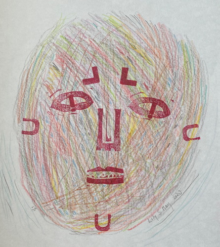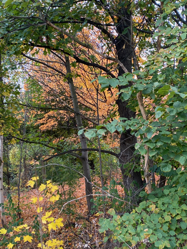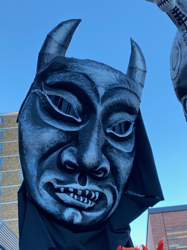 First, there’s the great mask of one of the giant Night of Dread puppets from October 26th this year. Next are two mixed media monoprint masks I made in the spring of 2023. After that is a photo at a pro Palestinian rally I attended recently. And there’s two photos I took this autumn–the first at Sandbanks Provincial Park in Ontario, the second near Brickworks Park in Toronto.
