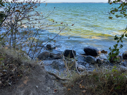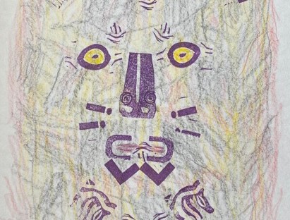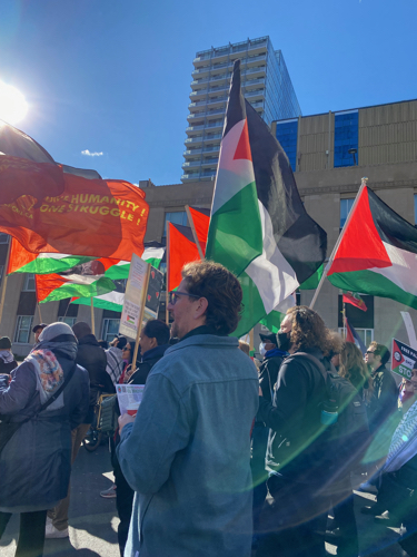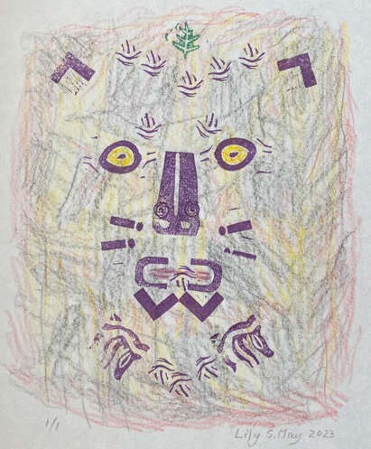 First, there’s the great mask of one of the giant Night of Dread puppets from October 26th this year. Next are two mixed media monoprint masks I made in the spring of 2023. After that is a photo at a pro Palestinian rally I attended recently. And there’s two photos I took this autumn–the first at Sandbanks Provincial Park in Ontario, the second near Brickworks Park in Toronto.