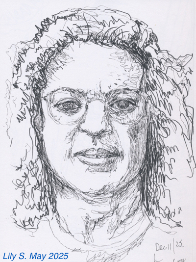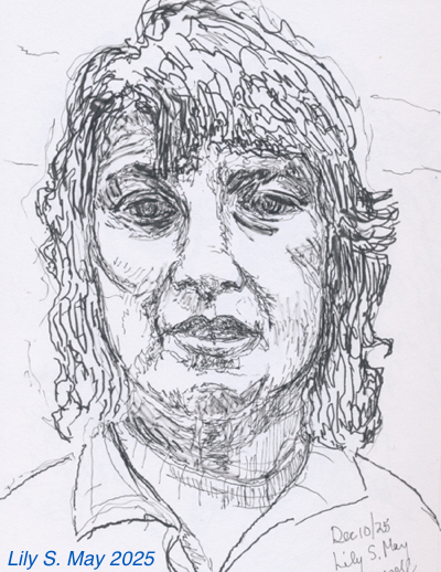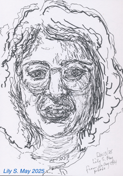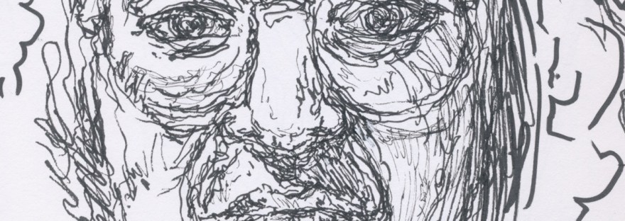 I began in late November and have been working in a sketchbook using felt pens of different widths. I choose the subjects as I go. I made the following 3 portraits from photos of myself taken in 1994 and 2001. None of the drawings look like me. In fact, one unintentionally looks a lot like a woman in the neighbourhood that I see on walks. I’ve painted portraits earlier in my life and found that we all look closer to one another than we may realize. A brush stroke here or there, a drawn ink line can change a face to someone other than the actual subject.